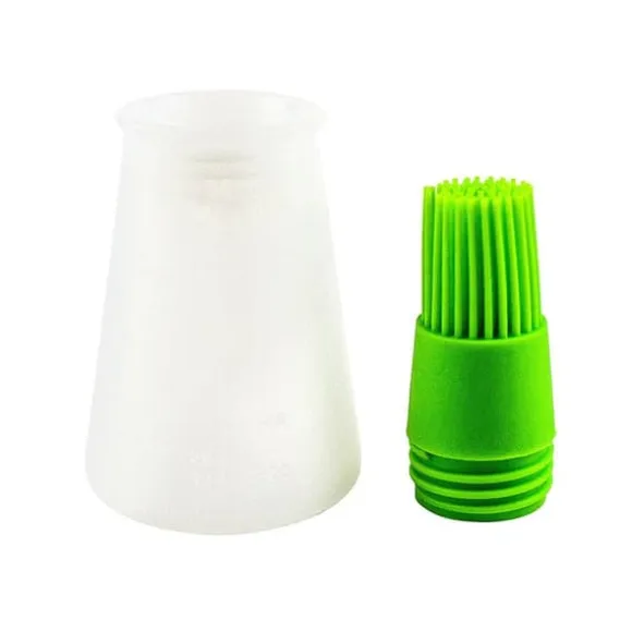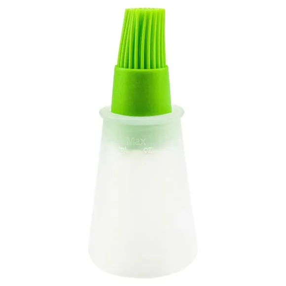 Den här gröna silikonpenseln med tillhörande behållare är ett användbart köksredskap till matlagning. Flaskan är klämbar och trycker ut innehållet till penseln, vilket gör det lite enklare och snabbare att pensla. Fungerar bra som bakpensel eller som oljepensel du kan använda som ett grill tillbehör. På sidan är flaskan märkt med mått angivna i ml och oz och den rymmer upp till 60 ml respektive 2 fl oz.