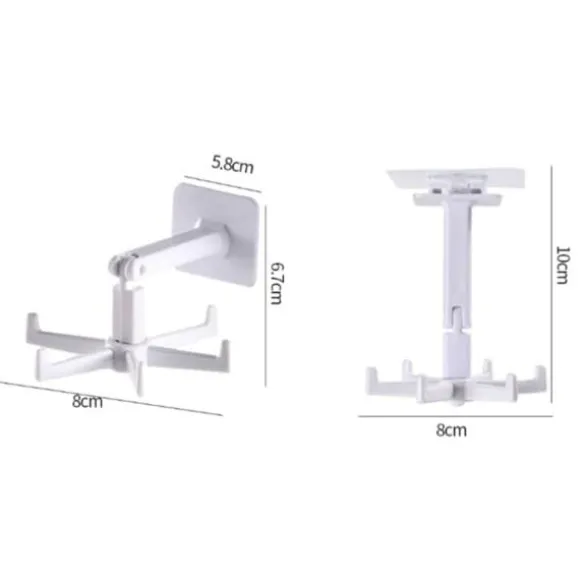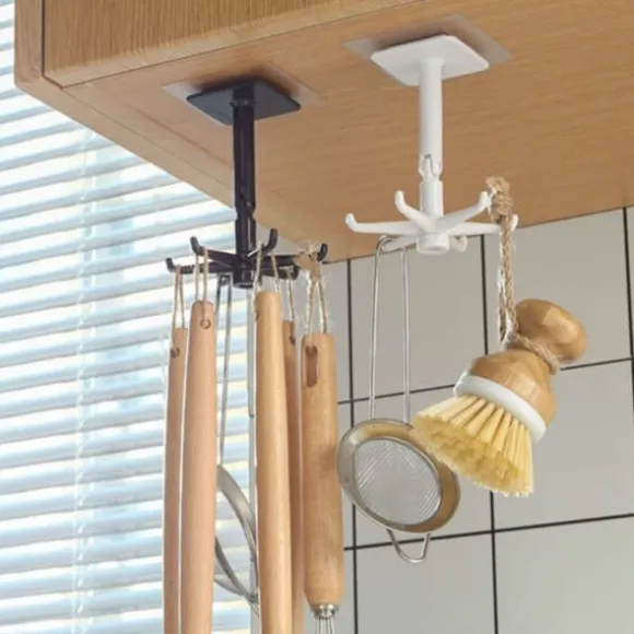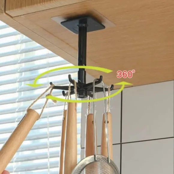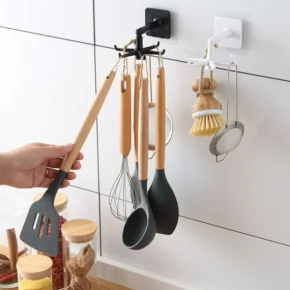 Med vår självhäftande krok kan du enkelt hänga upp dina köksredskap på väggen eller inuti skåpen. Inga verktyg eller hål behövs, bara dra av skyddsfilmen och tryck fast kroken på önskat ställe. Hållaren kan placeras både på väggen och under skåp tack vare sin justerbara design. Den kan även roteras 360 grader för enkel åtkomst till alla redskap!