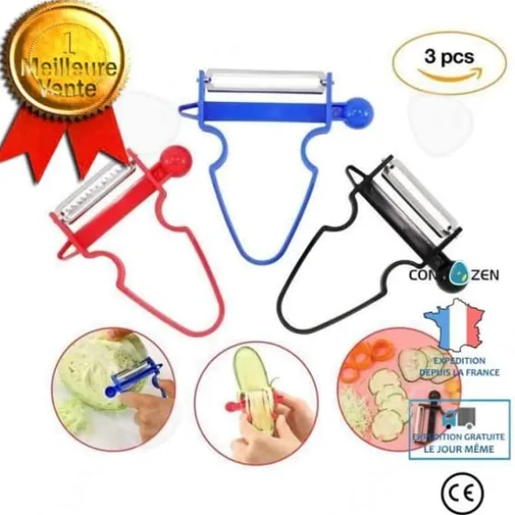 Upptäck 3-pack CONFO skalare, perfekta för att skala frukter och grönsaker. Tillverkade av ABS med ett blad 402, är de lätta (45g) och finns i svart, röd och blå. Dimensioner: 10×8.5×1.4 cm. Perfekt för ett praktiskt och färgglatt kök.