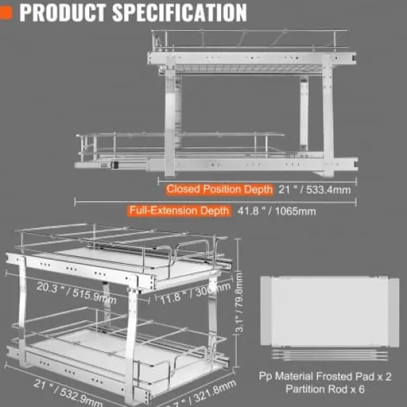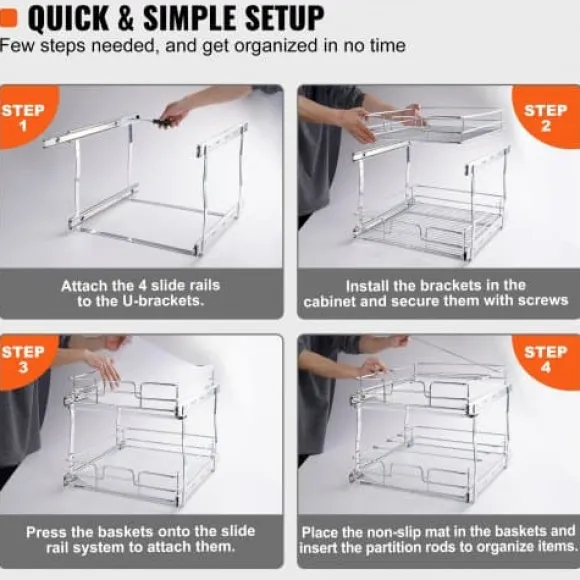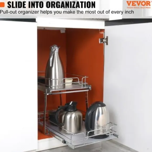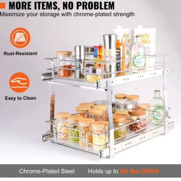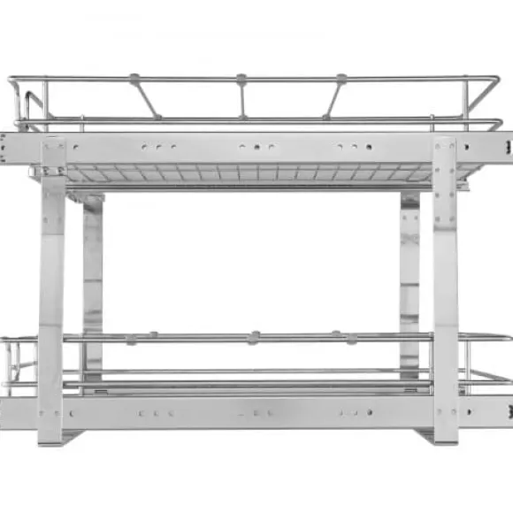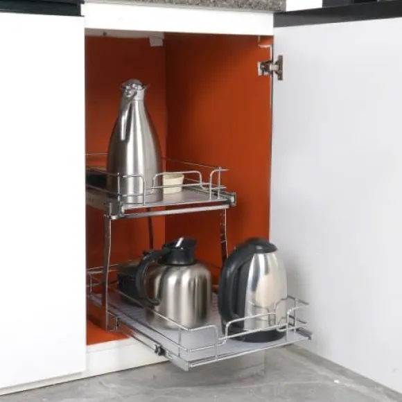 Maximera ditt skåputrymme med denna 2-vånings utdragbara organisatör, designad för smidig och tyst glidning samt enkel åtkomst till dina köksartiklar. Tillverkad av hållbart krompläterat stål, erbjuder den en robust och praktisk förvaringslösning för kastruller, stekpannor, burkar och rengöringsmedel. Det lättinstallerade systemet passar de flesta skåp och har avtagbara brickor för enkel rengöring.