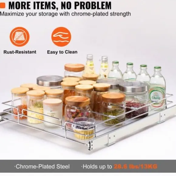 Maximera ditt skåputrymme med denna kraftiga utdragbara organisatör, designad för smidig och tyst utdragning även vid tung belastning. Den robusta konstruktionen i krompläterat stål säkerställer hållbarhet och enkel skötsel, vilket gör den idealisk för förvaring av kastruller, stekpannor, rengöringsmedel och mer. Enkel installation och en avtagbar bricka ger extra bekvämlighet för alla hem.