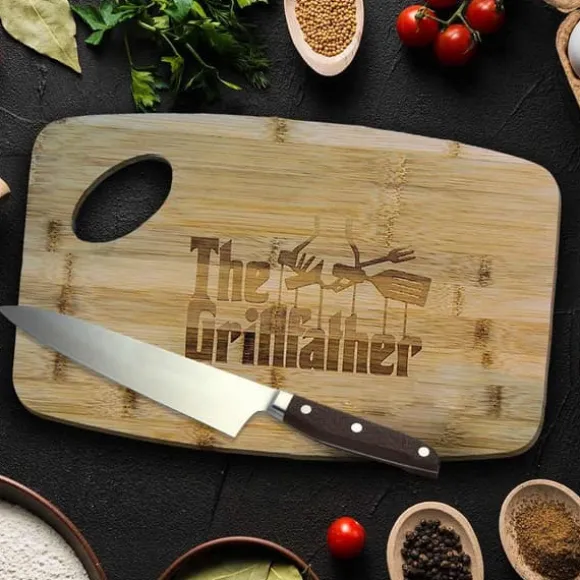 En skärbräda tillverkad i högkvalitativ bambu. Skärbrädan pryds med texten “The Grillfather” – utmärkt för alla som vill kunna hänvisa till sitt film- och matintresse i ett och samma verktyg. Bambumaterialet gör att skärbrädan ser snyggare ut än de i plast, samtidigt som den är enkel att rengöra. Kan även användas som ett ställ för kryddor eller kökstillbehör som du vill ha framme på köksbänken.