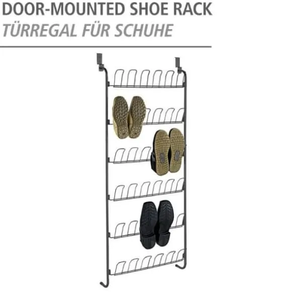 Fullständig beskrivning: Förvara med stil – skostället för dörrar framträder med stil Detta utrymmesbesparande skoställ för dörrar sparar inte bara utrymme utan skapar också ytterligare förvaringsutrymme i en garderob, skohyllan, i sovrummet eller omklädningsrummet. 36 välvda krokar ger förvaringsmöjligheter för upp till 18 par skor som kan