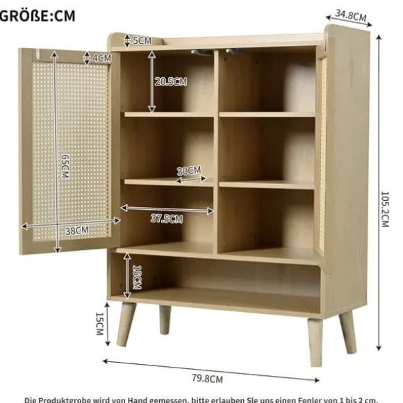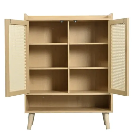 Detta eleganta skoskåp i naturlig rotting kombinerar funktionalitet med naturinspirerad design. Med två dörrar och fem rymliga hyllplan är det en perfekt förvaringslösning för hallen, sovrummet eller andra utrymmen där ordning och stil är lika viktiga. Tack vare det barnsäkra formspråket och push-to-open-funktionen får du både säkerhet och bekvämlighet.