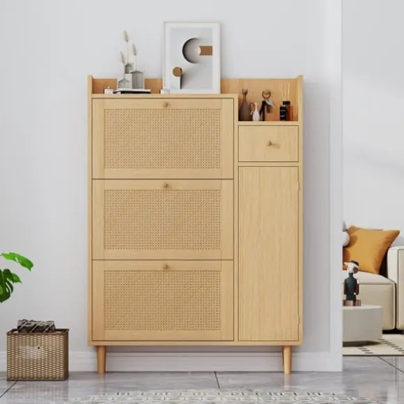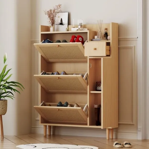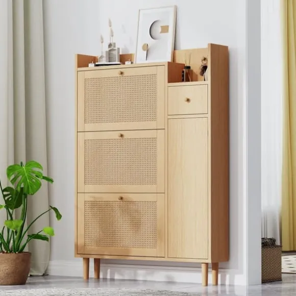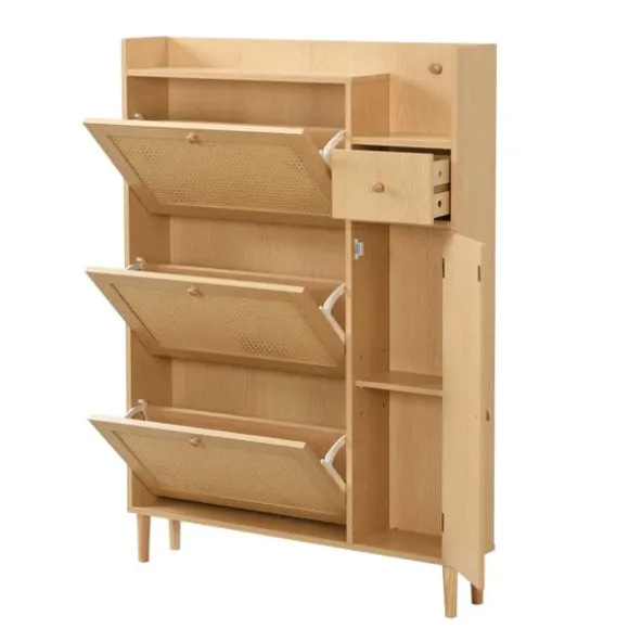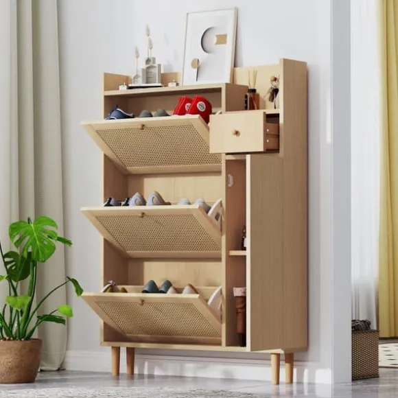 1. Harmoniskt och naturligt färgschema och design: Detta skoskåp kommer att lämna ett bestående intryck med sin eleganta design och naturliga, trevliga färgschema. Den passar perfekt med olika inredningsstilar och kan integreras sömlöst i hallar, sovrum eller vardagsrum för att ge dig ett elegant och organiserat utseende.