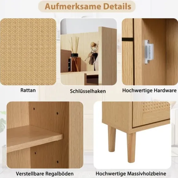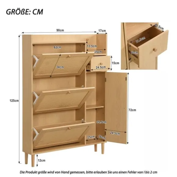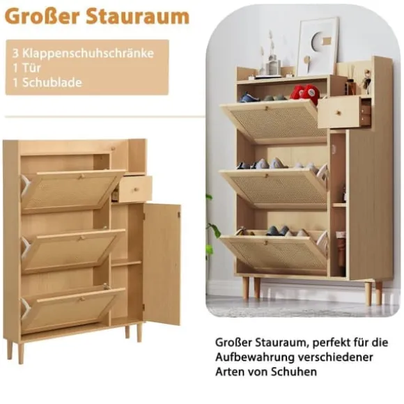 3. Stort förvaringsutrymme: Detta skoskåp erbjuder en imponerande mängd utrymme. De tre flikarna gör att du kan hålla dina skor snyggt organiserade. Dessutom kan du använda sidolådorna för nycklar, mynt och andra småsaker. Den nedre dörren kan öppnas för att förvara paraplyer eller stövlar. Med detta skoskåp får du en praktisk lösning för att hålla dina skor snygga och inom räckhåll.