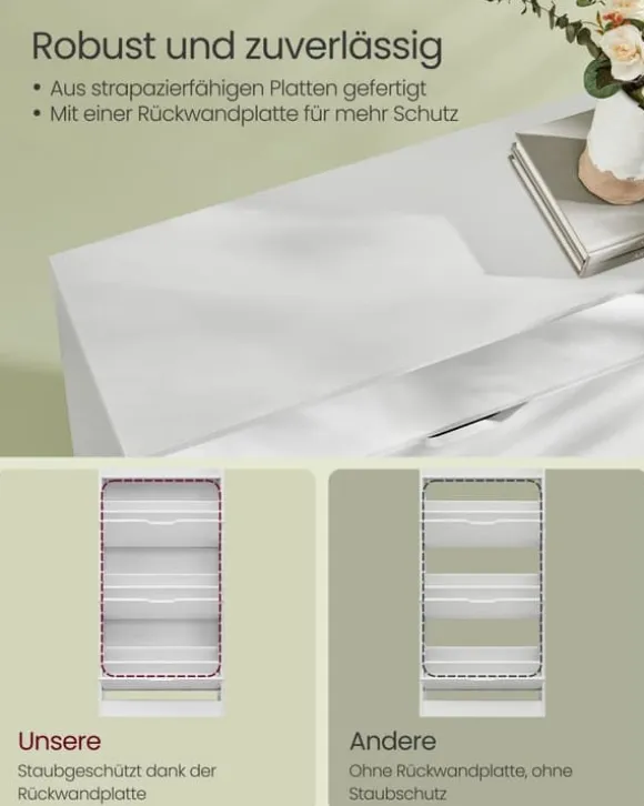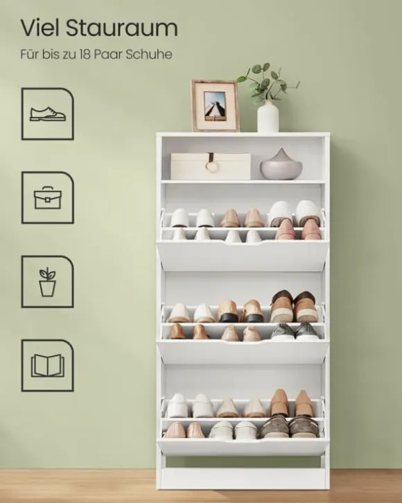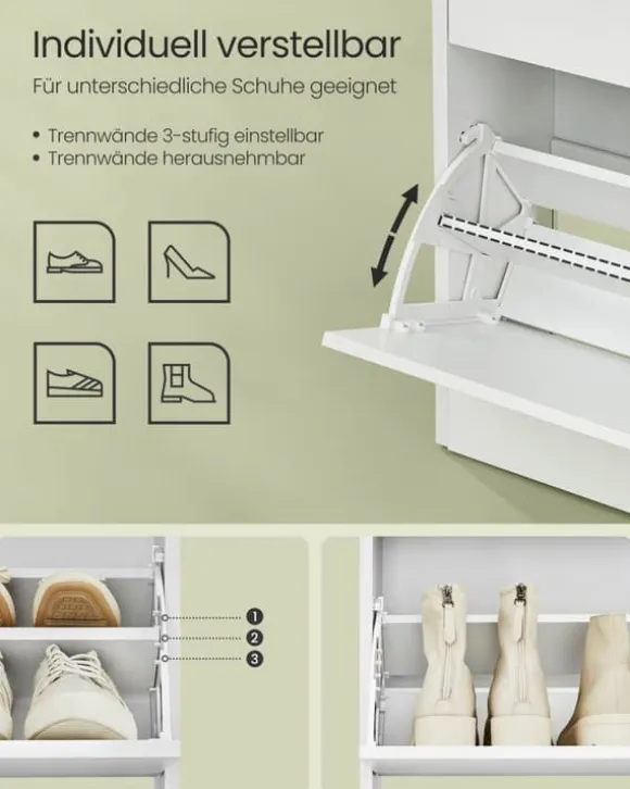 [Rymlig och mångsidig] Denna skohylla rymmer 14 till 18 par skor! Dessutom, med sina öppna förvaringsutrymmen, kan du iscensätta dina växter, foton eller minnen i en verkligt unik organisation[Anpassningsbar och utrymmesbesparande] Med flyttbara avdelare och 2 nivåer som kan justeras med avdelare passar detta skoskåp många olika typer av skor. Justera det, växla det och optimera ditt utrymme enligt dina önskemål[Pålitlig under sin livstid] Tillverkad av högkvalitativa sprickbeständiga paneler och utrustad med en bakpanel för att skydda dina skor från damm och insekter, är denna smala förvaring en säker fristad[Elegant och sofistikerad] Detta skoställ för korridoren, med sin rena design och minimalistiska estetik, är mer än funktionellt. Det är en möbel som bekräftar din stil och förhöjer inredningen i ditt hem[Enkel montering] Med våra illustrerade steg-för-steg-instruktioner har vi gjort monteringen av denna hylla mycket enkel. På bara 30 minuter kommer du att ha en ny snygg och funktionell möbel i ditt rum