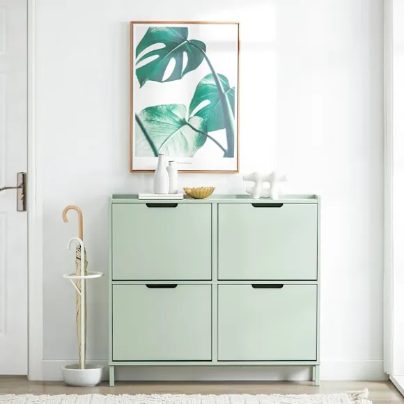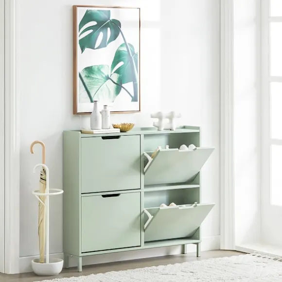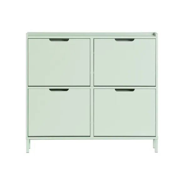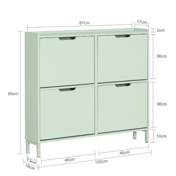 Till skillnad från de flesta skåp har vårt skoskåp fyra tippdörrar. Dessa kan enkelt öppnas och stängas med handtagen. Den är också lämplig för trånga områden.
