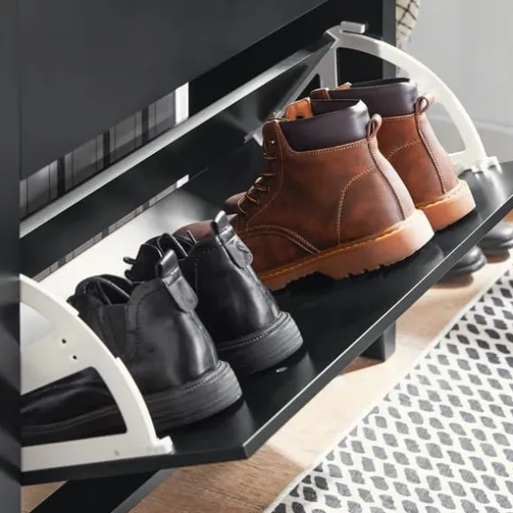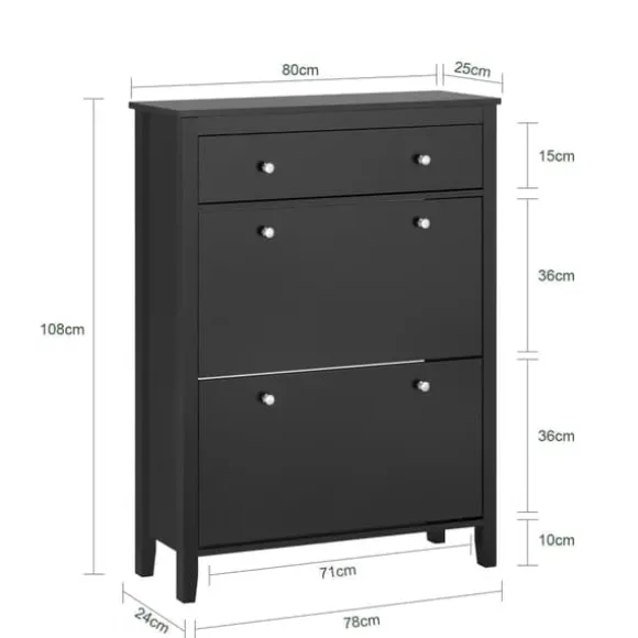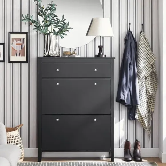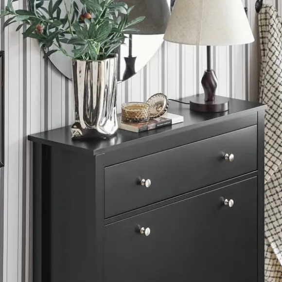 Den svarta finishen och silverdetaljerna ger en modern känsla som enkelt matchar annan inredning. Den smala designen (25 cm djup) gör den perfekt även i trånga lägenheter eller smala hallar.