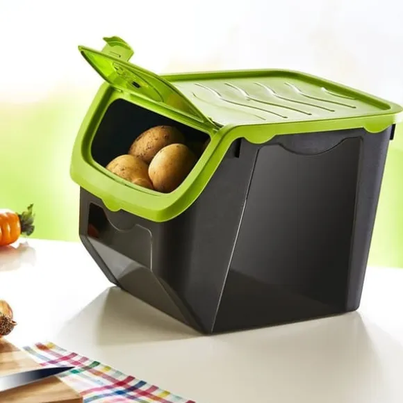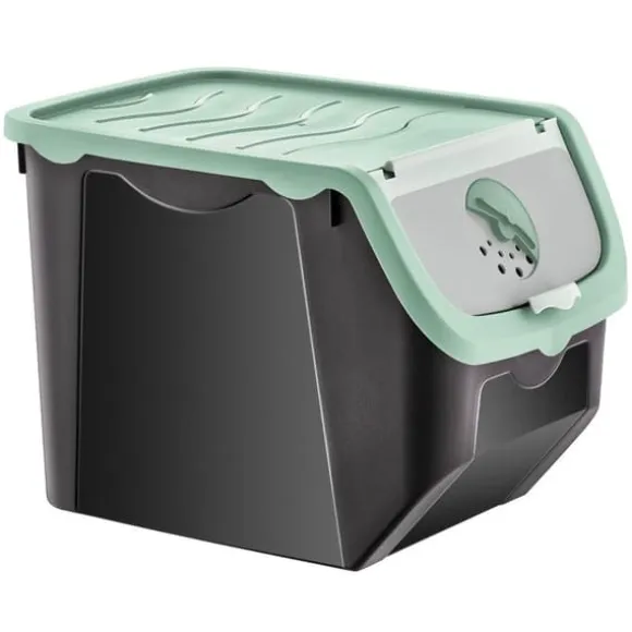 Frukt- och grönsaksbehållare med måtten 30 x 23,5 x 23,5 cm och en kapacitet på 12 liter. Behållaren är tillverkad av högkvalitativ svart plast och har ett pistagefärgat lock. Den har justerbar ventilation, vilket säkerställer att frukt och grönsaker håller sig fräscha längre. Bekväm att använda tack vare det clip-open locket. Du kan enkelt ta bort och stoppa in önskade grönsaker. Behållaren kan förvaras i frysen. Det är lätt att rengöra eftersom det tål diskmaskin.