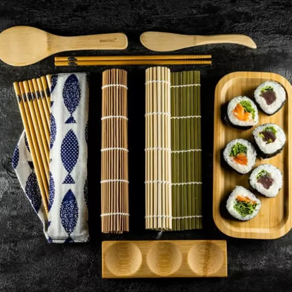 Ett originalset för att göra och servera sushi. En perfekt present till älskare av det japanska köket, men inte bara. Vi har inkluderat recept och tips för att tillaga sushi i vårt set. Sushitillbehör är gjorda av 100 % naturlig bambu, vilket är ett ekologiskt och biologiskt nedbrytbart material utan skadliga effekter på din hälsa. Fri från BPA. Setet innehåller: 1 st – Platt matta för rullande sushi – effekten av en perfekt plan yta: ~24x24cm 1 st – Rund matta för rullande sushi – effekten av snabb, bekväm rullning: ~24x24cm 5 par av hög kvalitet. bambu ätpinnar med tygfodral: ~24cm 1 st – Spatel för att blanda ris med vinäger: ~18cm 1 st – Spatel för jämn spridning av ris: ~24cm 1 st 1 st – Bricka för servering av tre typer av såser: ~18×5,4cm Satsen är förpackad i en ekologisk, biologiskt nedbrytbar låda som mäter 27x19x4 cm ätpinnar. Det rekommenderas att tvätta för hand med en borste och ett milt rengöringsmedel. Efter tvätt, torka väl.