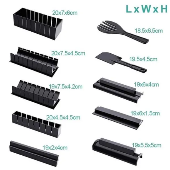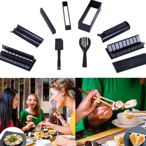 Set med 10 stycken för att enkelt göra sushi. Tillverkat av ABS och PP är detta verktyg livsmedelssäkert. Perfekt för fester, det låter dig skapa sushi i olika former snabbt och jämnt. Vikt: 640g. Perfekt för hela familjen.