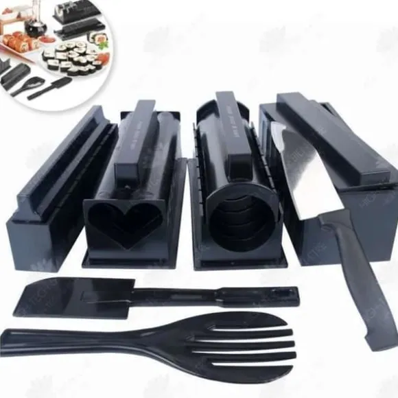 Upptäck detta set med 10 HTBE® sushi-formar i svart ABS, perfekt för att göra sushi hemma. Kompakt och lätt (675 g), den mäter 26*15*8.5 cm och levereras i en färgglad låda. Perfekt för japansk matlagning.