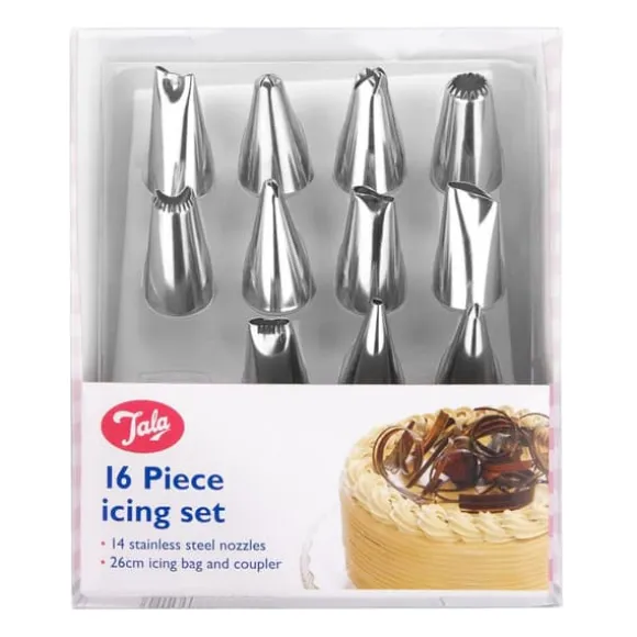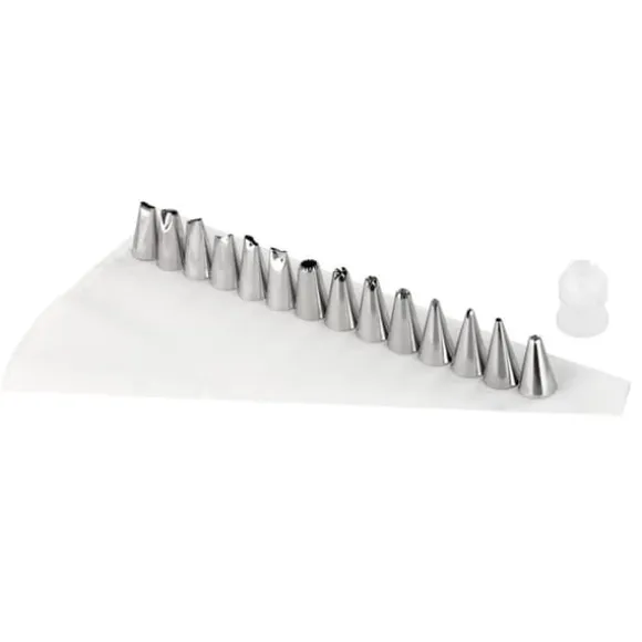 Adaptern kommer att göra byte av munstycken snabbare och enklare vilket underlättar dekoreringen. De 16 olika munstyckena hjälper dig att uppnå alla slags dekorativa mönster. Denna uppsättning innehåller en kvalitetspåse på 26 cm, en adapter för att underlätta byte av munstycken och 16 munstycken av rostfritt stål som täcker ett antal mönster. Munstyckena och påsen kan diskas i diskmaskin och återanvändas.
