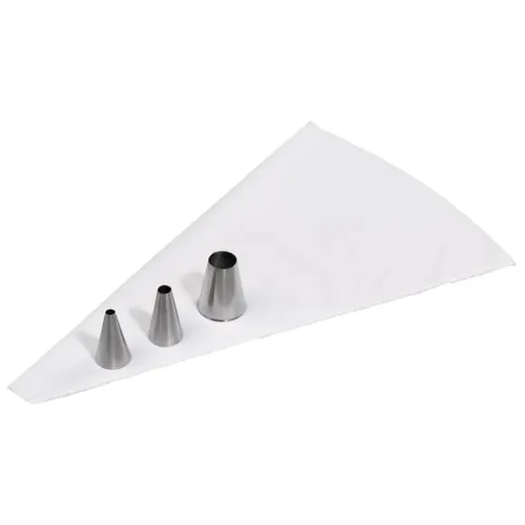 Uppsättning med 3 öppna tyllar i olika storlekar. Setet innehåller även engångspåsar. För spritsning av större runda virvlar, maräng, choux-bakverk och macaroons