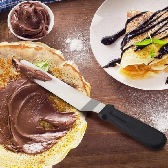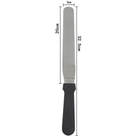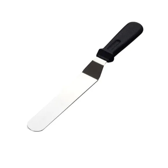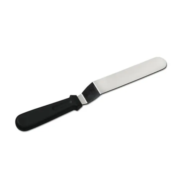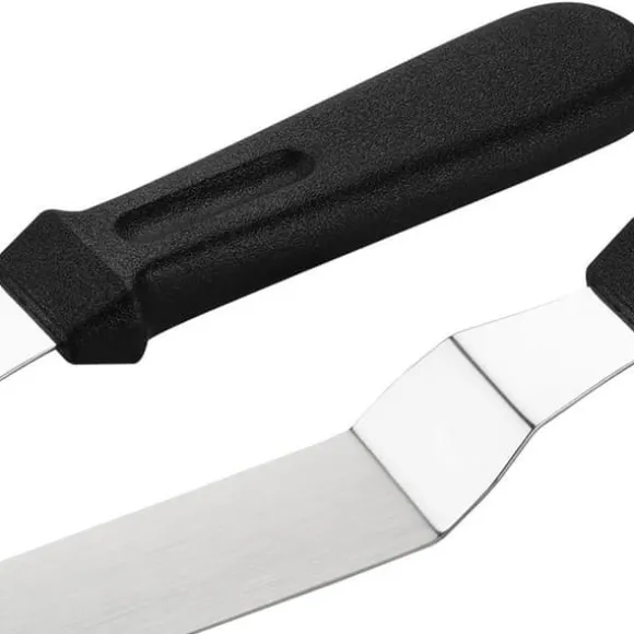 Vinklad tårtkniv / palettkniv i rostfritt stål för bakning och dekorering av tårtor och kakor. Perfekt när du ska sprida ut fyllning eller frosting. Tack vare det vinklade bladet kommer du lättare åt utan att handen stöter i bakverket. Palettkniven går också utmärkt att använda som stekspade.