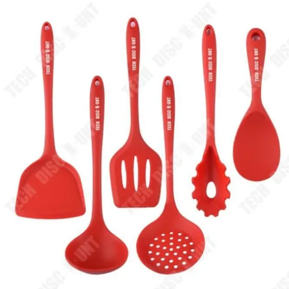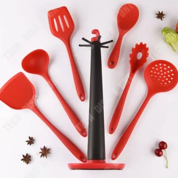 Produktnamn: uppsättning med 7 silikonspatlar Material: livsmedelsklassad silikon Färg: röd Vikt: 0,8 kg Användningsområde: panna, gjutjärnspanna Egenskaper: hög temperaturbeständighet, ingen skada på kastruller