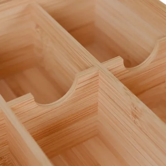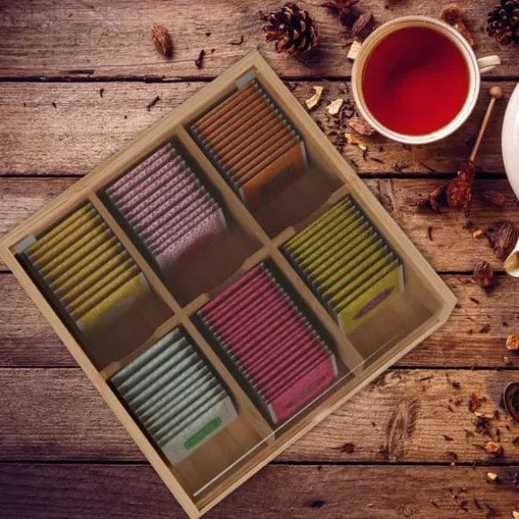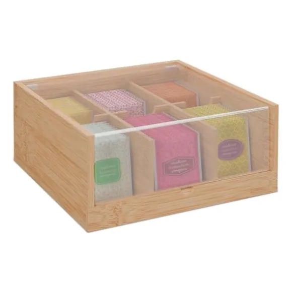 Håll din tesamling organiserad och dammfri med denna stängda tebox med sex fack och ett transparent lock för enkel överblick. Perfekt för förvaring av olika tepåsar, den fungerar även som en förvaringslösning för bakningsingredienser eller kaffekapslar. Den robusta konstruktionen i bambu och akryl garanterar hållbarhet och en naturlig look i ditt kök.