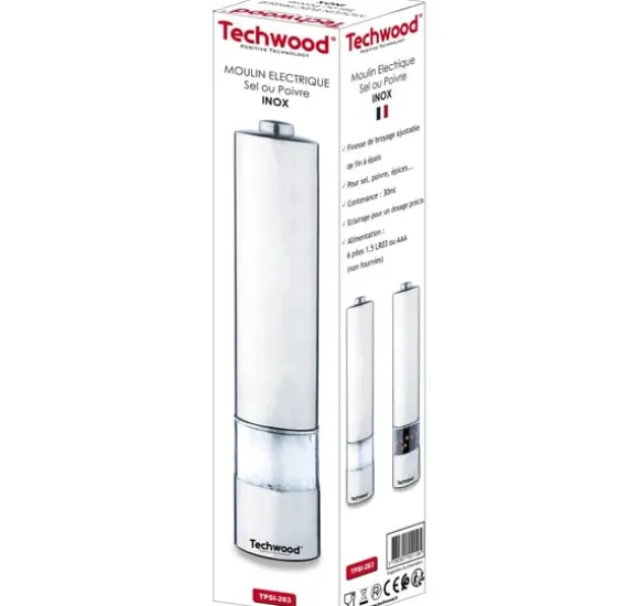 Techwood TPSI-263 elektrisk salt- och pepparkvarn i rostfritt stål är ett snyggt och bekvämt köksredskap. Malningsgraden kan justeras från fin till grov, vilket gör den idealisk för att mala salt, peppar och olika kryddor. Kvarnen med en kapacitet på 30 ml är utrustad med belysning, vilket säkerställer exakt dosering.
