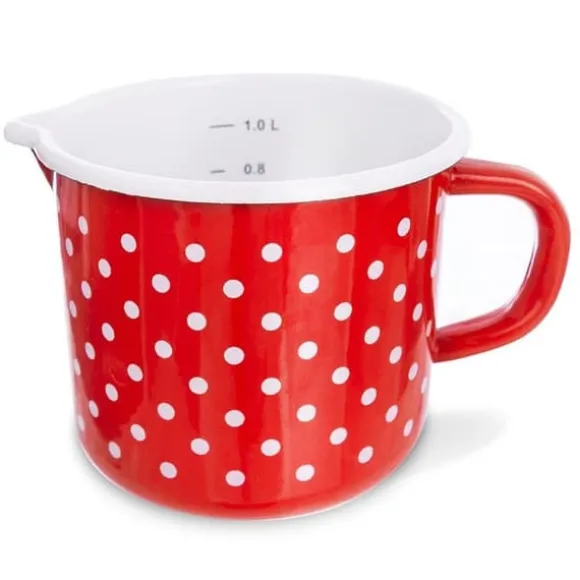 Emaljerad mugg med mätkopp, pip och handtag i retrostil. Tillverkad av slitstarka material, extremt praktisk och bekväm. Den kan användas för att tillaga och mäta ingredienser vid matlagning, bakning eller bryggning av drycker. Tack vare sin mångsidiga användning är den också perfekt för att göra såser, puddingar eller för att smälta choklad till desserter. Dess unika design gör muggen till en unik köksdekoration. Emaljerade köksredskap kan ha tillverkningsfel som är naturliga för denna typ av köksredskap: utbuktningar, asymmetriska tryck etc. Dessa påverkar inte produktens eller de tillagade rätternas kvalitet; de betonar bara den traditionella tillagningsmetoden. Muggen har en liten bottendiameter; inte alla induktionshällar är kompatibla; Kontrollera bruksanvisningen till din spishäll. Originalprodukt från det tjeckiska märket Orion. Tillverkad i enlighet med europeiska standarder.