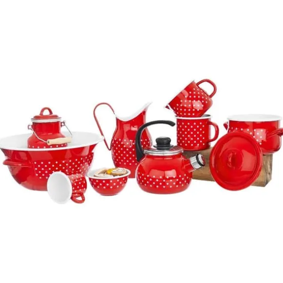 ✅ EMALJERAD – Tillverkad av högsta kvalitet, rött emaljerat stål. Den har en iögonfallande dekoration i form av vita prickar på ytan. Emaljen som muggen är täckt med är ett hälsovänligt material och till och med säkert för allergiker.