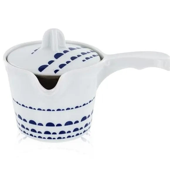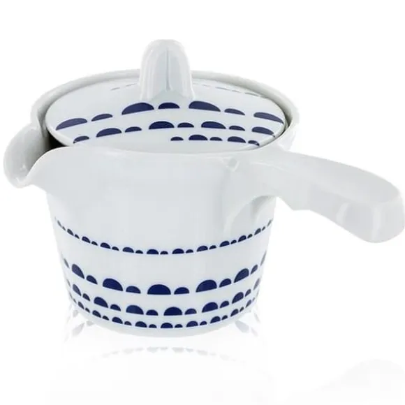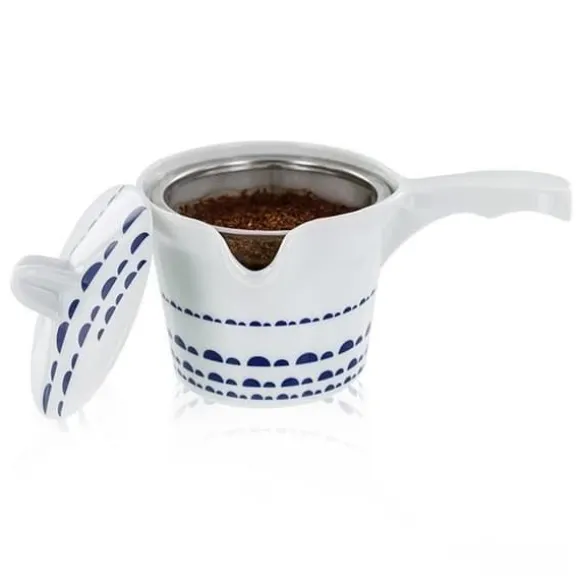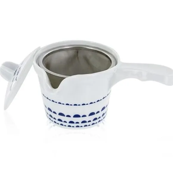 Denna typ av tekanna är oumbärlig för att förbereda gröna teer på ett kvalitativt och traditionellt sätt. Filtret i rostfritt stål medföljer tekannan. Användartips: Placera dina teblad i filtret i rostfritt stål och häll sedan över förvärmt vatten, och stanna nivå på vattnet under utfällningsspetsen. För att få ut det bästa av de kostbara gröna tebladen krävs en kort bryggtid (1-2 minuter), en måttlig vattentemperatur (70-80°C) för en stor mängd blad, och därför en tekanna av liten volym. Töm tekannan efter varje servering i 1 till 3 (små) koppar. Du kan å andra sidan göra 2-3 serveringar. Det är helt motsatsen till en västerländsk bryggning, i en stor tekanna med en enda bryggning på 3-6 minuter! Den blå koboltmönstrade hantverksmässiga vita konstporslinstekannan Kyoto har tillverkats av vår partner i södra Kina i 10 år, specialiserad på porslin. Kyoto-porslinstekannan är en så kallad ”minneslös” tekanna, eftersom dess material inte absorberar aromerna från de olika teerna. Den passar därför för alla dina teer! Skötselråd: Rengör filtret i rostfritt stål efter varje användning och undvik att använda diskmedel. Precis som för insidan av tekannan, föredra att rengöra den med klart vatten och torka den med en mjuk och torr trasa. Sammansättning: Porslin. Formning, handfinish, glasyr, färgning. 0,25 l.