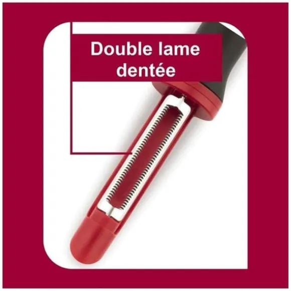Tomatskalare i plast, nylon och 15% glasfiber + handtag Insats i svart och rött rostfritt stål. Tandat blad. Snabb och enkel peeling av mjukt skinn. Perfekt peeling. Kan diskas i diskmaskin.