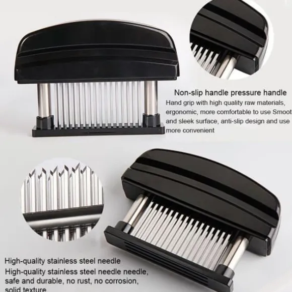 Köttmöraren är utformad med skarpa knivar av rostfritt stål som hjälper till att bryta ner tuffa fibrer och bindväv i köttet. Detta gör köttet öppet för marinader och kryddor, vilket ger det en mer utsökt smak och textur.
