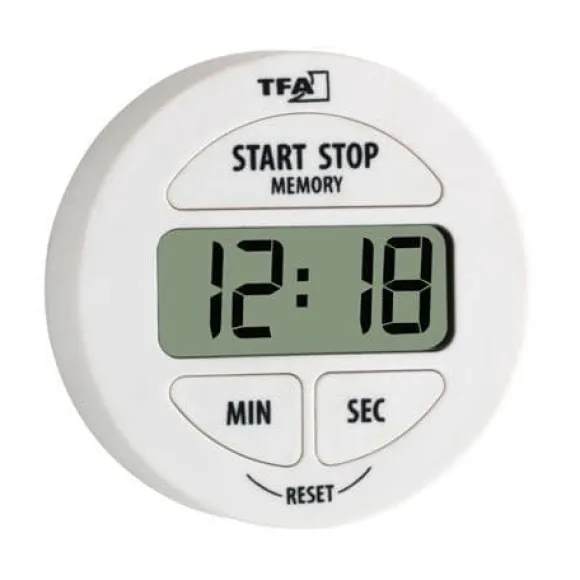TFA-DOSTMANN TFA 38.2022.02 elektronisk timer och stoppur är en praktisk tillbehör för att mäta tid. Dess mått är 54 x 54 x 16,5 mm. Den drivs av ett LR44-batteri. Färgen är vit.