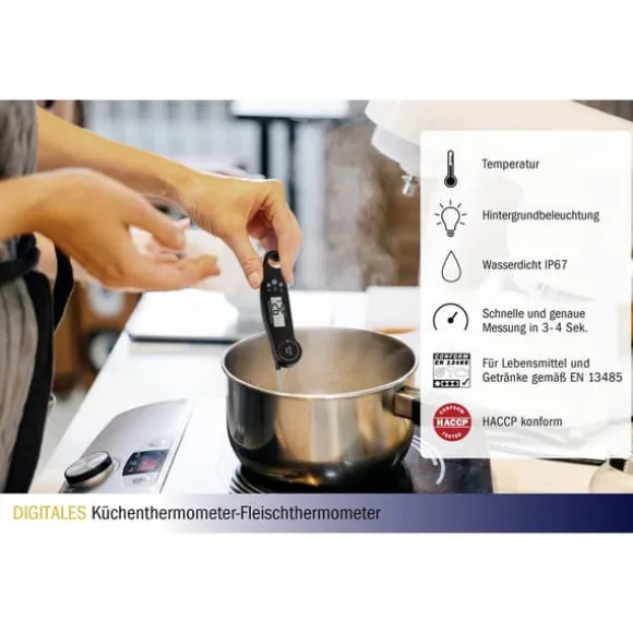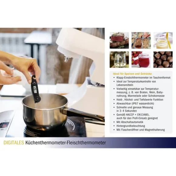 - För temperaturkontroll av mat och dryck Hopfällbar termometer i fickformat Insticksgivare i rostfritt stål 110 mm Snabb och exakt mätning, noggrannhet: +/- 1 °C på -20 °C…150 °C, responstid: 3…4 sek. Hold-, högsta och lägsta värden funktion bakgrundsbelysning IP67 vattentät Med flasköppnare och magnethållare