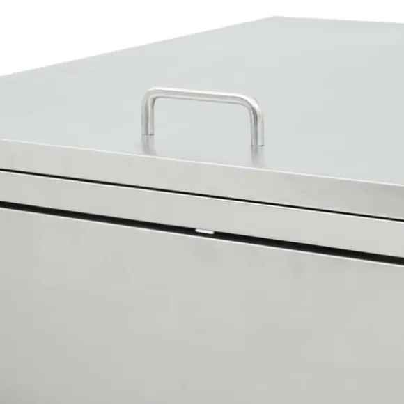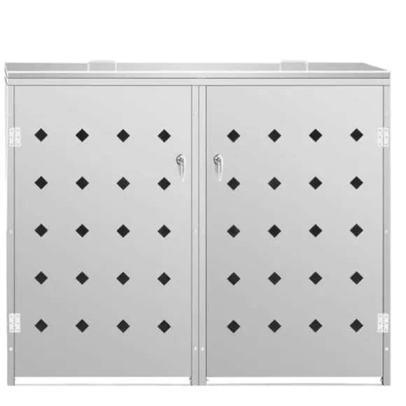 Skjulet för sopkärl är tillverkat av rostfritt stål och är ytterst väderbeständigt och hållbart. De praktiska ventilationshålen möjliggör luftcirkulation och förhindrar otrevliga lukter i skjulet, medan låssystemet gör att soporna förvaras säkert. Dessutom låter den praktiska dörren dig att enkelt sätta in och ta ut sopkärlet.