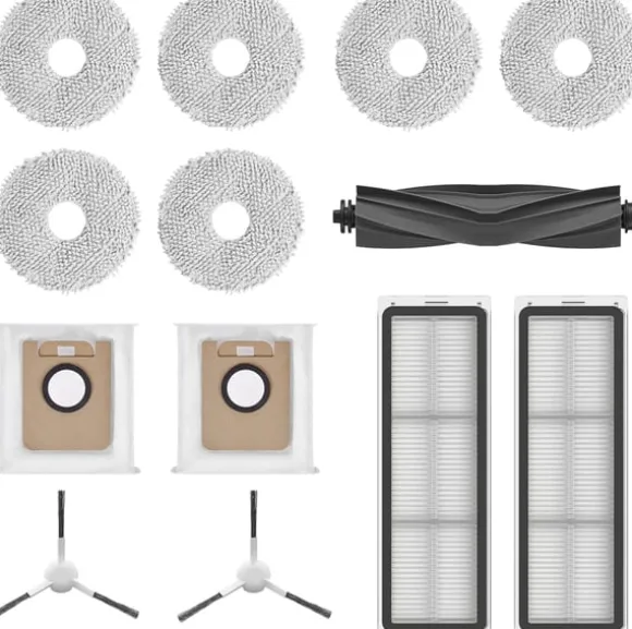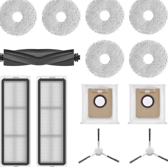 Tillbehörssats för Dreame L10s / L10 Ultra robotdammsugare, innehållande gummiborste, sidoborstar, dammsugarfilter, moppdynor och dammsugarpåsar.