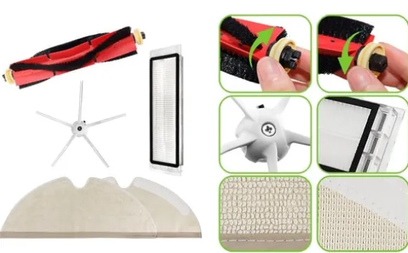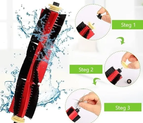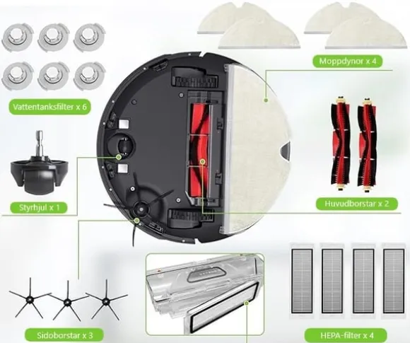 - Medföljer: 2 huvudborstar, 4 HEPA-filter, 4 moppdynor, 3 sidoborstar, 6 vattentankfilter, 1 styrhjul