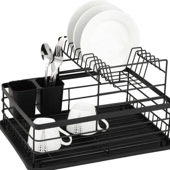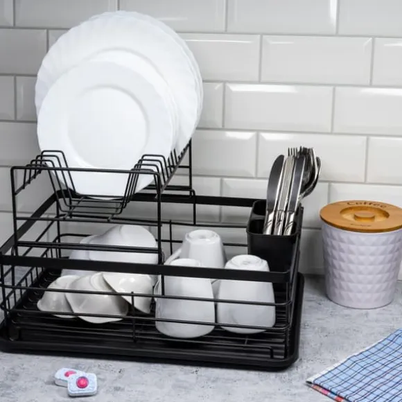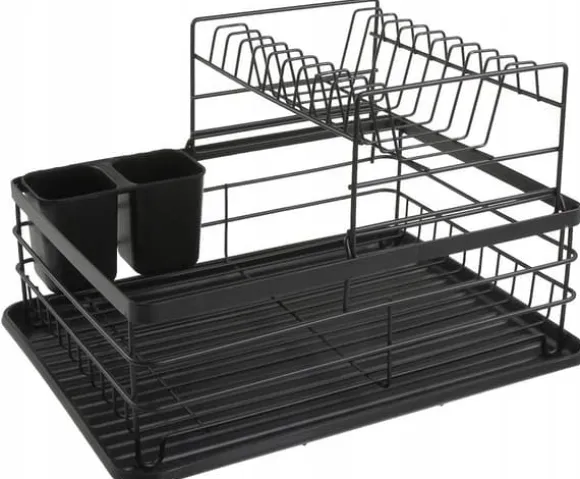 KINGHOFF tvåvånings diskavlopp. Inkluderar en bestickavlopp i två fack i plast. Drain har en smart design som gör det möjligt att torka ett stort antal diskar samtidigt. Den svarta pulverlackerade metallramen kompletterar alla kök.