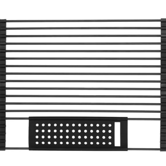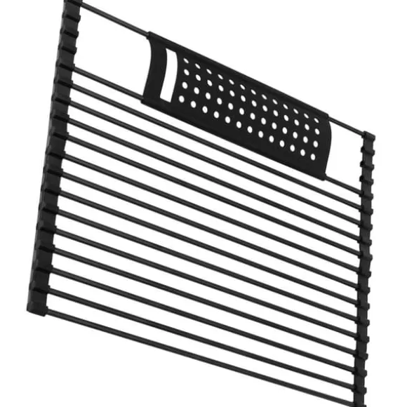 Universal avlopp i stål för diskhon. Den har 15 stavar av rostfritt stål, pulverlackerad svart. Extra hylla för småsaker och bestick. Silikonkanterna gör att du kan rulla ihop avloppet och vid behov klippa det till önskad bredd. Låter dig torka tvättad frukt eller grönsaker. Den kan även användas som avlopp för diskad disk eller bestick. När den är ihopfälld tar den liten plats och kan förvaras i en låda. Egenskaper: Funktionell – idealisk för att tvätta frukt och grönsaker eller torkning av disk Kompakt – när den är ihoprullad tar den väldigt lite plats, passar i alla kökslåda Universal – den enkla och moderna formen på avloppet gör att den passar in i alla köks inredning. Mått: 47 x 36 cm