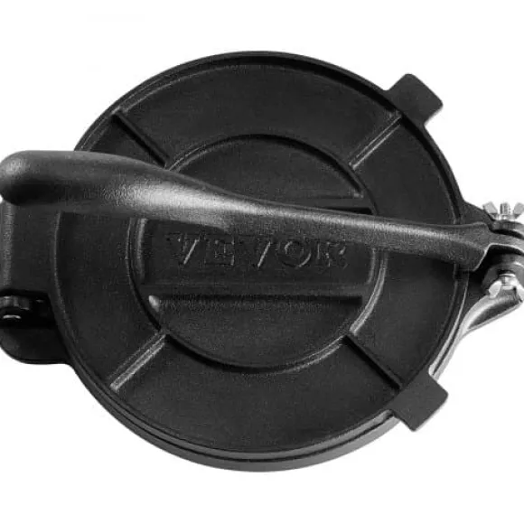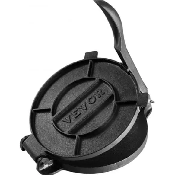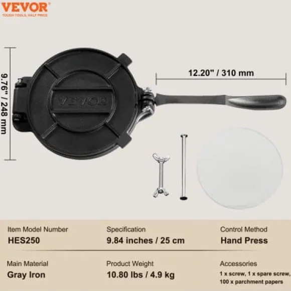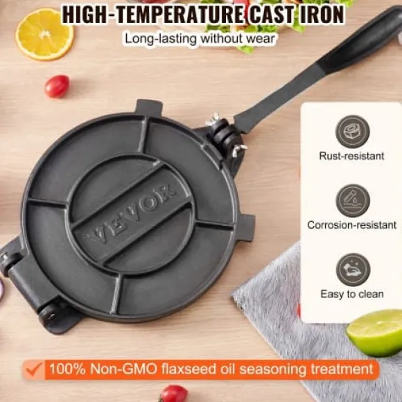 Denna robusta tortillapress i gjutjärn är utformad för enkel och effektiv tillagning av tortillas, rotis, pizzor och andra flatbröd hemma eller i professionella kök. Den extra stora storleken och det ergonomiska handtaget gör det enkelt att pressa degen, medan den förkryddade ytan garanterar hållbarhet och enkel rengöring. Klar att använda direkt ur förpackningen och levereras med bakplåtspapper för att förhindra att degen fastnar och förenkla din matlagning.