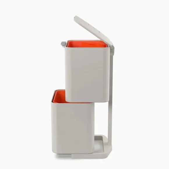 Välj denna selektiva sorteringsbehållare i rostfritt stål. Dess kompakta form erbjuder dock en stor kapacitet på 40L. Två stora kärl på 20L vardera och ytterligare en liten löstagbar behållare för ditt matavfall. Locket har ett kolfilter, som förhindrar obehagliga lukter. Adoptera det, det blir ditt nya väsentliga!