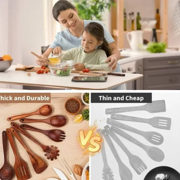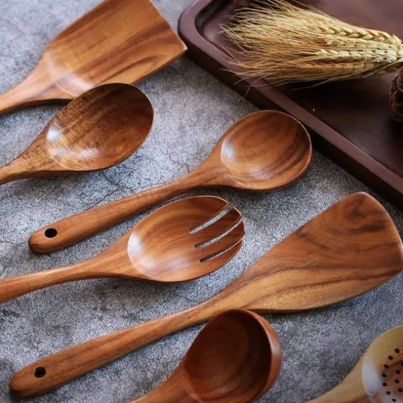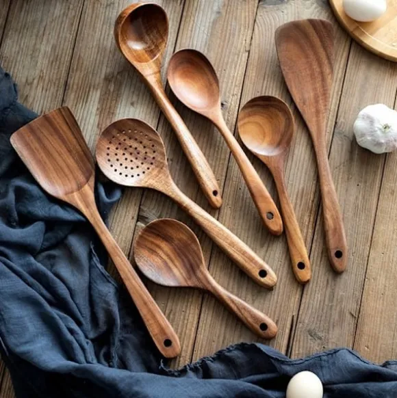 Träslevar set för matlagning, 7-delad teakträredskap, Träslevset för kök i naturligt trä