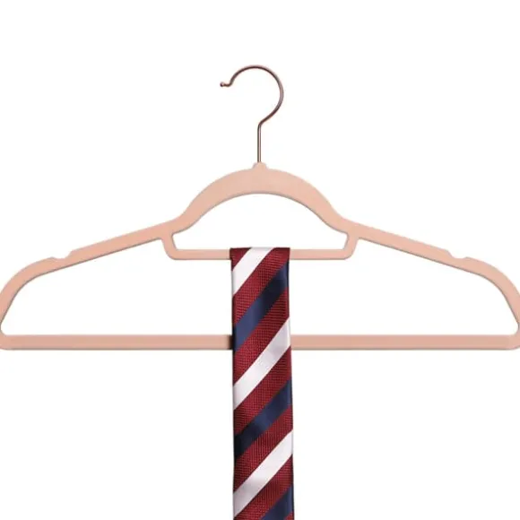 Den integrerade mittstången gör det möjligt att hänga halsdukar, slipsar eller bälten, vilket gör galgarna ännu mer mångsidiga. Den eleganta kombinationen av rosa sammet och roséguldfärgade krokar ger din garderob en stilren och lyxig touch.