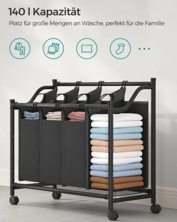 Denna tvättkorg med en kapacitet på 140 liter erbjuder en idealisk lösning för att organisera din tvätt. Fyra separata fickor håller alla dina kläder sorterade efter färg eller typ, vilket sparar tid under tvätten.
