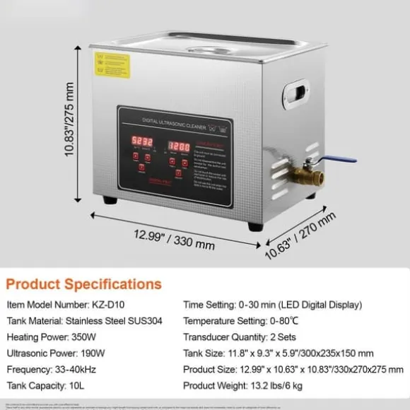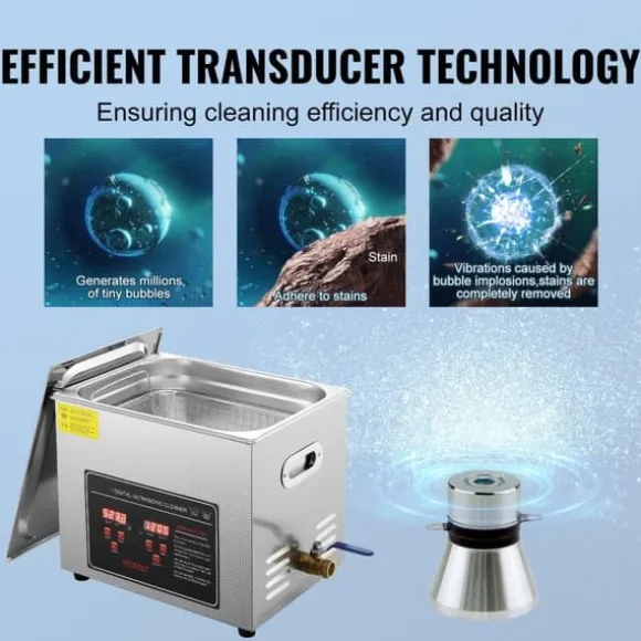 Hög rengöringsprestanda: Utrustad med två industriella ultraljudsgivare erbjuder denna ultraljudsdelare rengöringskraft på 183 W. Med en frekvens på 33 till 40 kHz tar den enkelt bort fläckar utan att skada dina föremål. Den har en robust, extra tjock 0,04 tum (1 mm) rostfri ståltank med en kapacitet på 2,6 gallon (10 L), vilket garanterar lång hållbarhet.