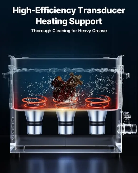 Den generösa volymen rymmer flera delar samtidigt och ger jämn ultraljudstäckning, vilket sparar både tid och rengöringsmedel i verkstaden eller hemma.