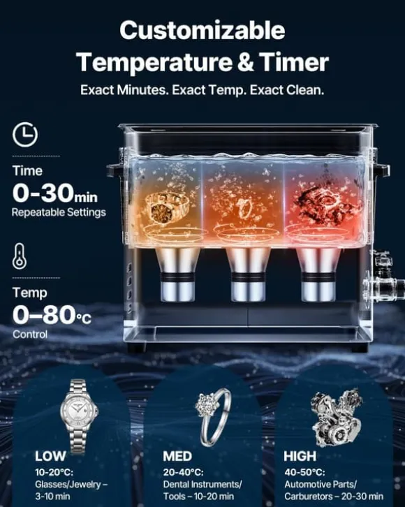 Temperatur 0–80 °C och timer 0–30 minuter låter dig anpassa processens intensitet. Högre värme löser upp oljor snabbare, medan kortare cykler skyddar känsliga material för optimal finish.