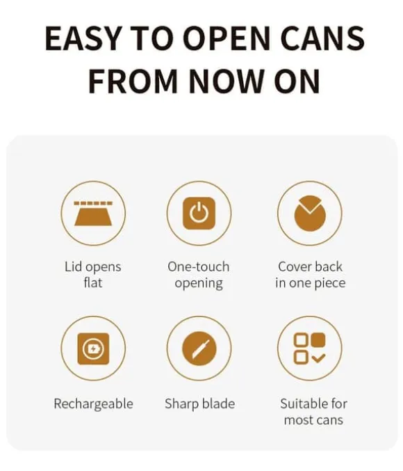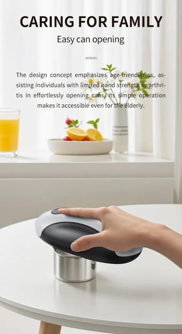 5.Perfekt elektrisk burkeöppnare för seniorer: Designad för komfort och säkerhet, erbjuder denna elektriska burkeöppnare för seniorer hands-free drift och tyst prestanda. En genomtänkt gåva och ett oumbärligt köksverktyg för åldrande föräldrar eller någon som värderar lätthet och säkerhet.