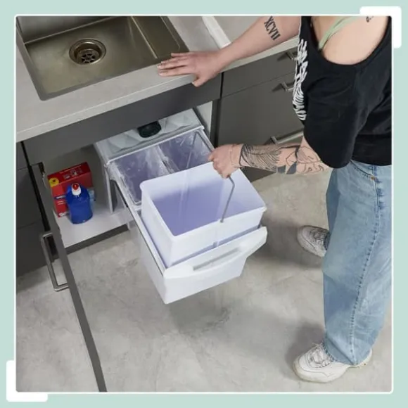 Denna utdragbara avfallsbehållare erbjuder en praktisk lösning för effektiv avfallssortering och platsbesparande installation under diskbänken. Dess teleskopskena säkerställer smidig, full utdragning för enkel åtkomst, medan det uppfällbara locket hjälper till att hålla odörer inne och fungerar även som en praktisk hylla. Designad för enkel integrering i skåp, levereras den med monteringsmaterial för enkel installation.