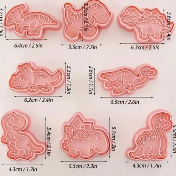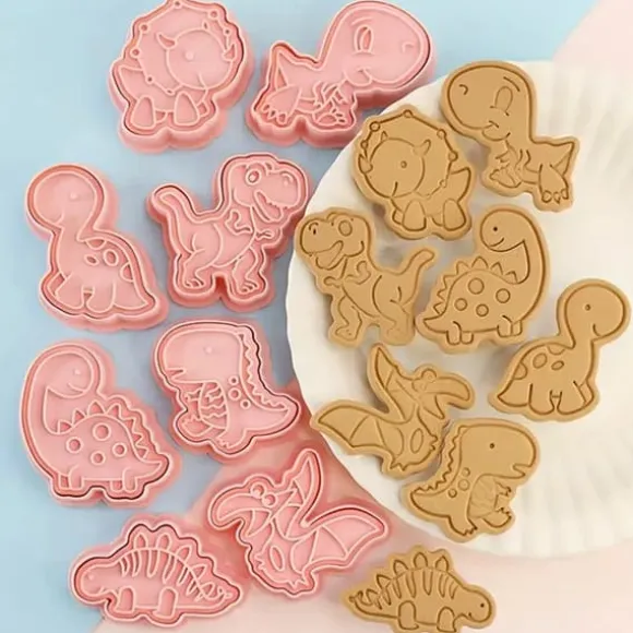 , som är perfekta för att göra kakor, pepparkaksdekorationer eller sockerpastadekorationer. Varje utstickare avbildar en annan söt dinosaurie, inklusive triceratops, tyrannosaurus, stegosaurus och många fler!