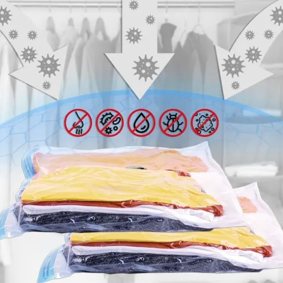 ENKEL ATT ANVÄNDA – När påsen är fylld med föremål suger vi ut luft med hjälp av en dammsugare eller sugpump, vilket minskar påsens volym och sparar utrymme. Genom att ta bort överflödig luft kan vi spara upp till 75 % av utrymmet. Mycket användbar när du reser eller förflyttar dig.