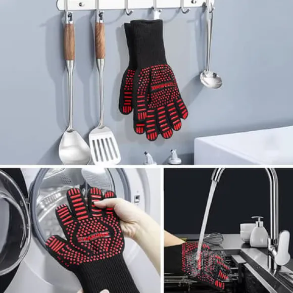 Dessa grillhandskar är perfekta för den som älskar att grilla och baka. Med hög skyddsnivå mot heta ytor och extrem värme, kan du tryggt hantera grillgallret, kol och andra varma redskap utan att oroa dig för brännskador. Handskarna har en solid och hållbar konstruktion som garanterar långvarig användning även vid intensivt bruk. Den speciella ytan på handsken ger ett bra grepp, vilket minskar risken för att halka när du hanterar heta verktyg och mat.