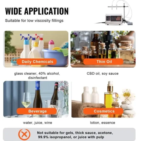Denna vätskefyllare hanterar drycker, vin, mjölk, vinäger, soja, alkohol (koncentration under 40 %) och andra vätskor och pastor med god flytbarhet. Perfekt för dagligt bruk hemma eller i din verkstad.