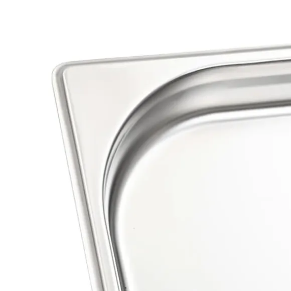 Eftersom den är tillverkad i starkt rostfritt stål har kantinen en massiv konstruktion som är enkel att rengöra. Dess slitstarka material är repfritt och enkelt att underhålla. Kantinen har standardmått och du kan därmed använda den universellt och med ett stort antal kombinationer. Följaktligen passar den perfekt i alla dina professionella köksskåp och med utrustning såsom vattenbad, chafing och salladsbarer. Plåten går att stapla och kan gömmas undan för att spara plats, därför är den väldigt praktisk och optimal för användning i restauranger, på hotell såväl som i hemmet.